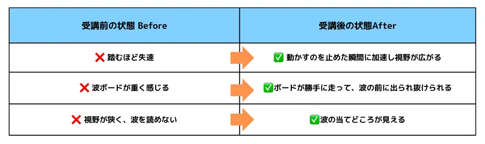 この講座を通じて、あなたのサーフィンライディングはガラリと変わり、再びサーフィンを心から楽しめるようになるでしょう。